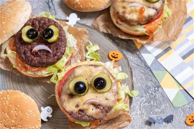 Make these spooky Jack-O-Lantern Burgers for a quick dinner with easy clean-up on Halloween evening. Just cut a slice of cheese into a circle and cut out shapes to make a fun Jack-O-Lantern and add it to your burger. If you don't prefer cheese on your burger, you can also make fun faces with toppings like tomatoes, onions, and olives!