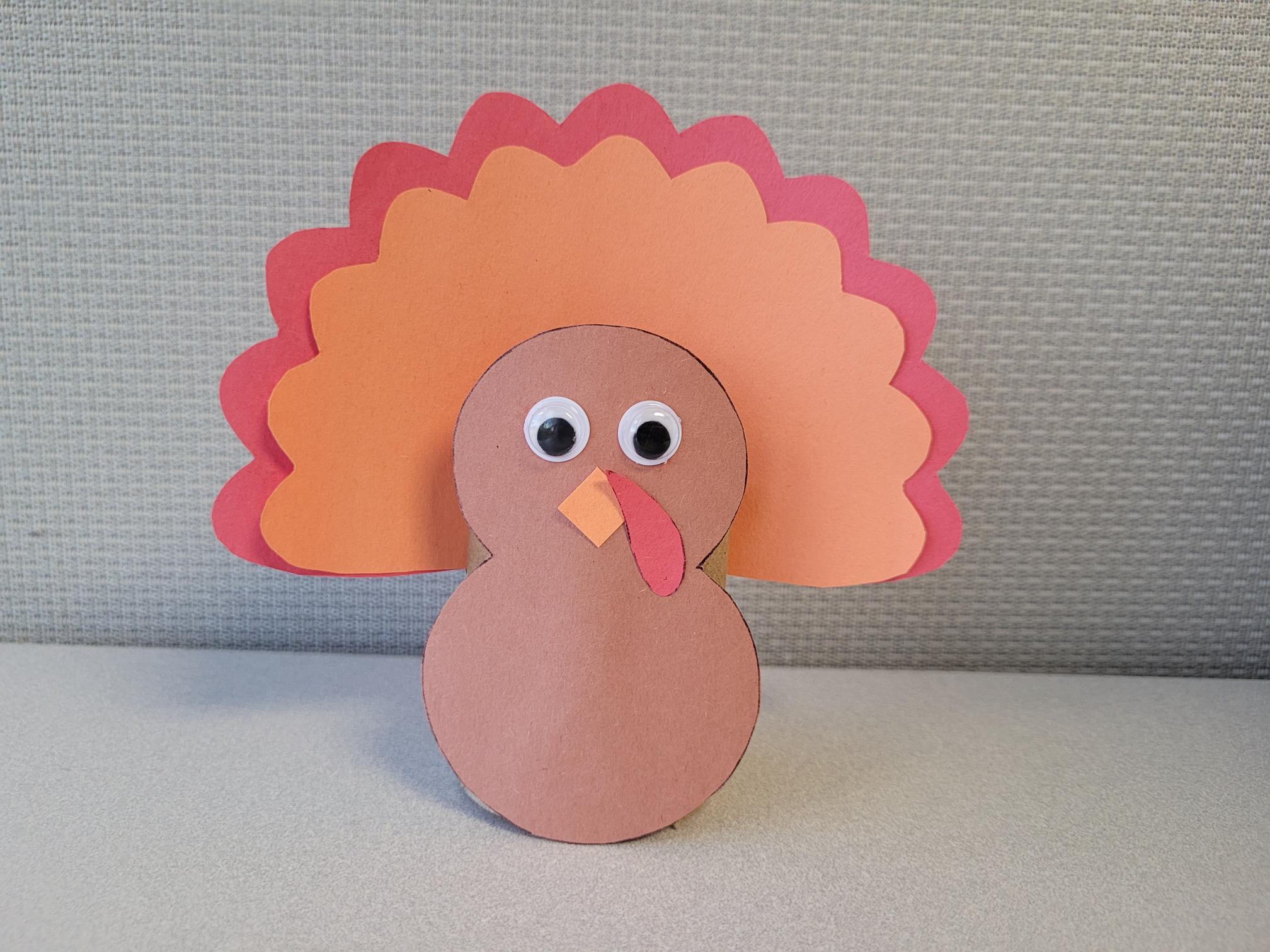 As you can see in our step-by-step video, this turkey is an easy one for all ages, especially those who have mastered the fine motor skill of scissor use! (If not, no worries, a parent or older child can help with this part.) The base for our turkey is an empty toilet paper roll, which gives its belly a curved edge and helps it to stand proud.