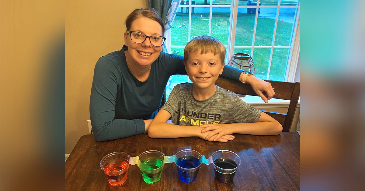 Once set up, they all work in harmony to create a blended array of colors that are sure to wow your little one. The colors will travel right before their eyes! To show you how it’s done, LCG’s Charlotte Armitage and her son, Ethan (9), created their own Traveling Rainbow at home.